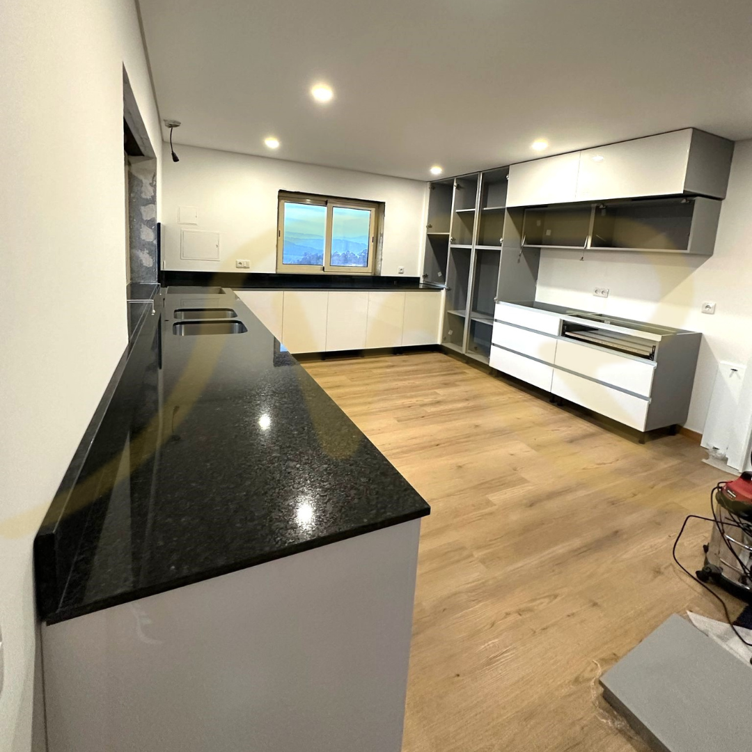 Cozinha lacada alto brilho na cor branco e detalhe em cinza
